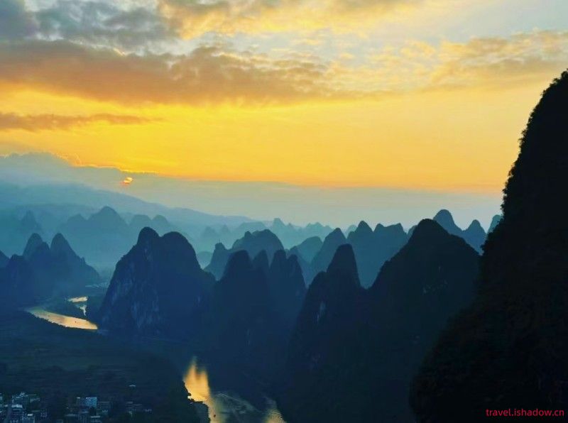 万丈金光刺破云层,将天空与峰林染上辉煌的色彩。作为一处享有盛誉的观景地,相公山坐落于黄布倒影与九马画山两大著名景点之间。其核心魅力在于能够俯瞰漓江在此处形成的壮美“第一湾”全景。独特的喀斯特峰林地貌,使得从山顶观景台远眺时,无数青翠山峰如阵列般有序铺展,清澈的漓江宛如碧绿丝带,在群峰间蜿蜒流淌,景致极为壮阔。
